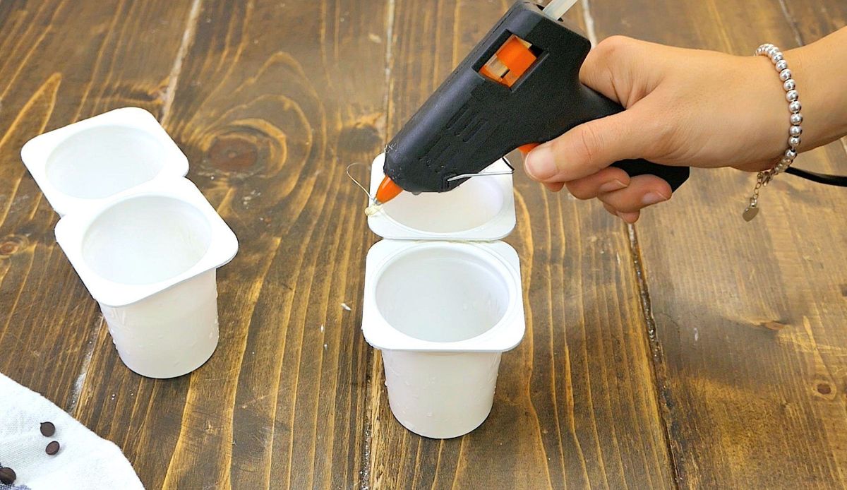 Do złożenia organizera potrzebne są tylko trzy rzeczy: czyste pojemniki, pistolet do gorącego silikonu i, jeśli chcesz, trochę farby, aby poprawić wykończenie. Szklanki są sklejane ze sobą, aż utworzą kompaktową strukturę, zaprojektowaną tak, aby pasowała do wnętrza skrzynki.