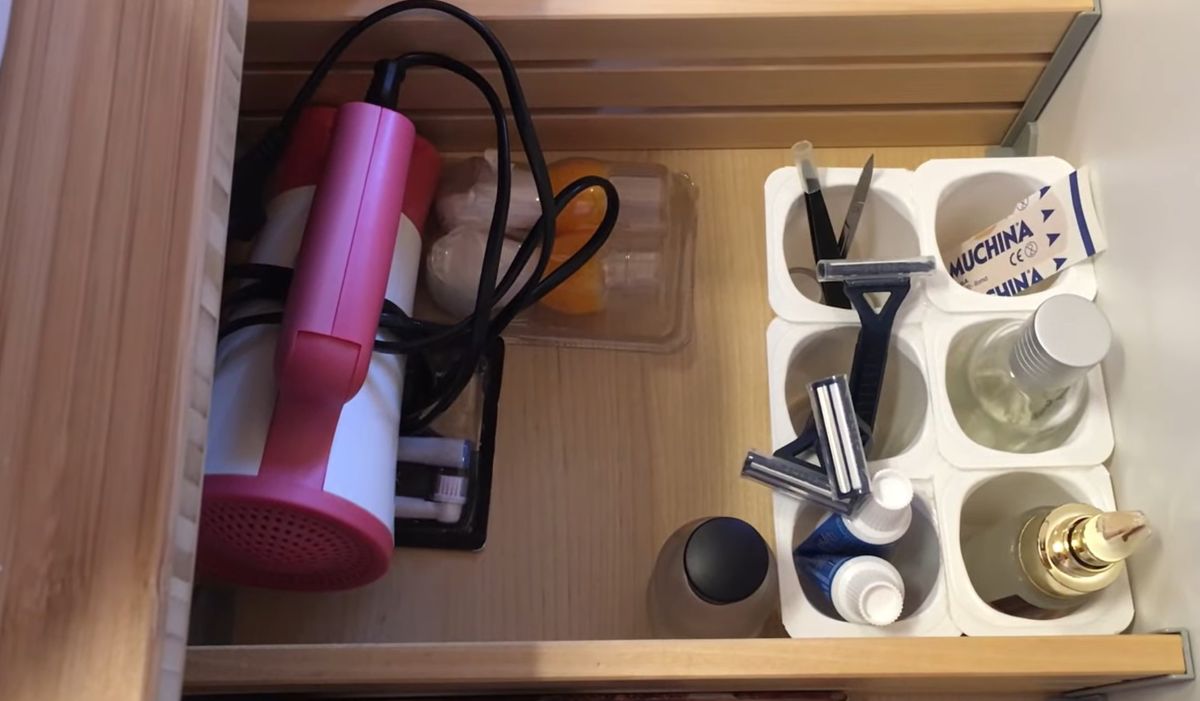 Po zainstalowaniu kubki po jogurcie zyskują nowe życie jako pojemniki na drobne przedmioty: pęsety, spinki do włosów, zapasowe ostrza, gumki do włosów lub kosmetyki. Każda rzecz ma swoje miejsce, co pozwala uniknąć wrażenia bałaganu w szufladzie, który tak bardzo zniechęca do porządkowania. Pomaga to utrzymać porządek i szybko znaleźć potrzebne rzeczy, gdy się spieszymy.