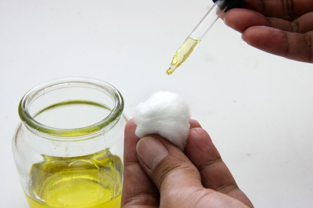 Po oczyszczeniu obszaru należy przygotować bawełnę, dodając kilka kropli olejku eterycznego z drzewa herbacianego, pomarańczy lub goździków, które są najbardziej skuteczne.