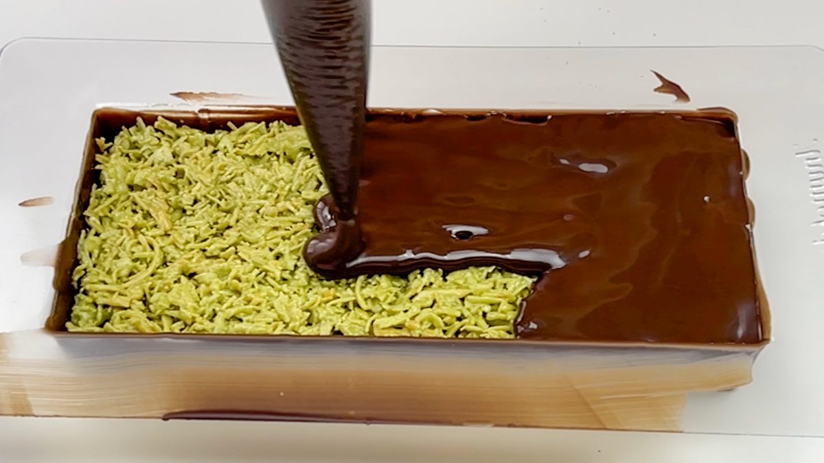 5. Dodaj mieszankę pistacji i kataifi na czekoladowy spód i delikatnie dociśnij, aby wyrównać (mocne dociśnięcie pomaga uzyskać równe cięcie).