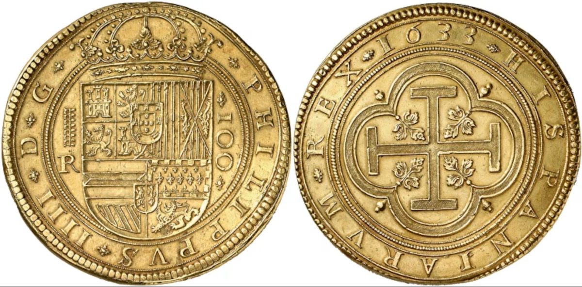 Centén waży 339,35 gramów, co czyni go największą złotą monetą XVII wieku, jaką dotychczas znamy. Moneta należała wcześniej do prestiżowej kolekcji Caballero de Yndias, zgromadzonej przez kolekcjonera baskijskiego mieszkającego na Kubie. W 2009 roku moneta ta osiągnęła już rekordową cenę 800 000 euro, stając się wówczas najdroższą monetą numizmatyczną w Hiszpanii.