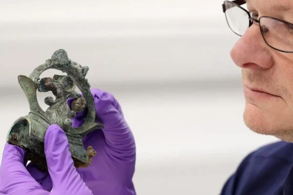 Kocioł, elementy wozu, ozdobna biżuteria: cenne przedmioty znalezione w skarbcu w Melsonby rzucają nowe światło na rytuały Wielkiej Brytanii w epoce żelaza. Element uprzęży ze …
