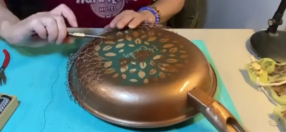 Po wyschnięciu elementów przystępujemy do łączenia siatki z patelnią. Najpierw wykonujemy formowanie, umieszczając siatkę na połowie patelni. Za pomocą szczypiec zagnij siatkę, aby owinęła krawędź, a nadmiar zagnij do tyłu.