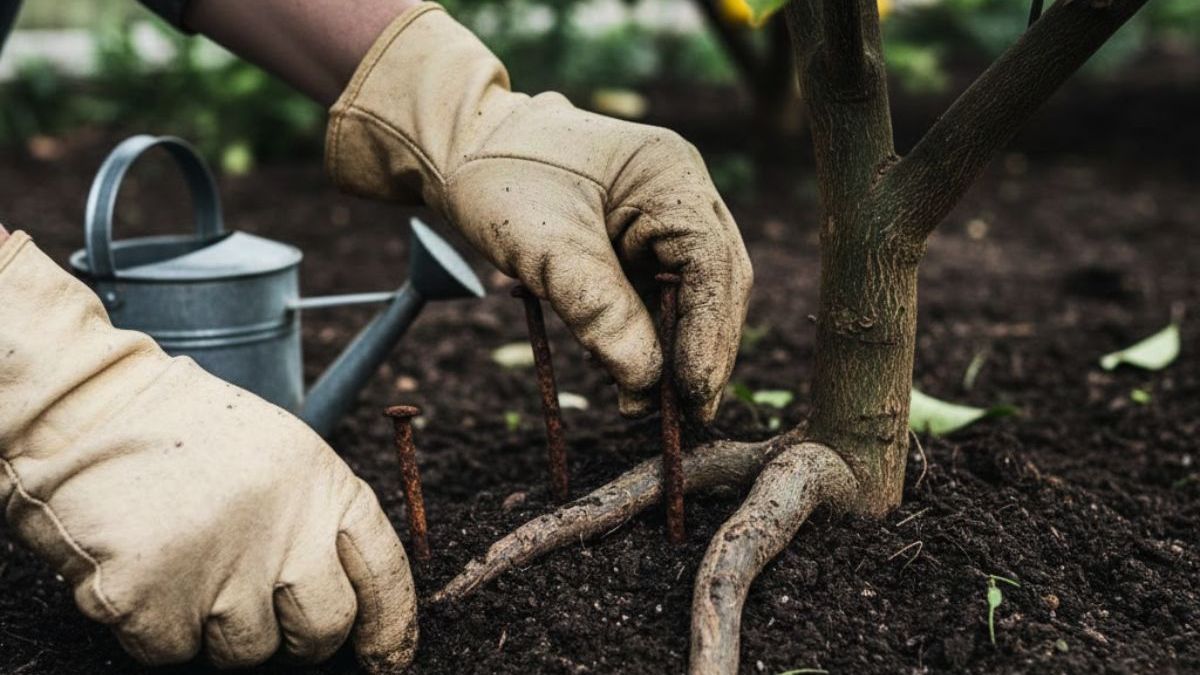 Umieszczanie zardzewiałych gwoździ w ziemi drzewa cytrynowego ma na celu dostarczenie żelaza i cynku, które są mikroelementami niezbędnymi do fotosyntezy i rozwoju drzewa.